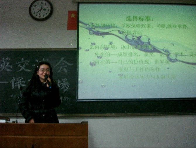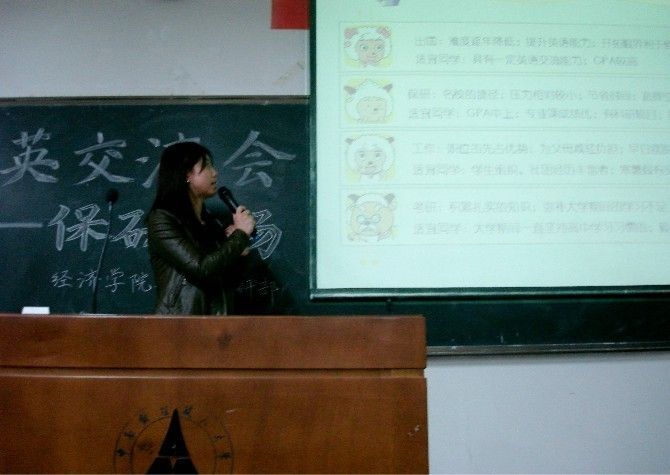 (新闻中心 何耀海吴超彦)11月18日晚7点整,由第十三届经济学院分团委学生会调研部主办的精英交流会之保研专场在文澜106顺利召开。受邀参加此次交流会的嘉宾是四位09级刚刚保研成功同学,他们分别是黄慧颖、赵阳、刘谦慧和应佳卉。交流会开始之前十分钟讲台下便座无虚席了,同学们怀着对保研的向往和憧憬,在交流会中体验了一场充满困难却又满怀希望的保研之旅。 第一个讲授保研经验的是成功保研至中山大学管理学企业管理专业的黄慧颖,她在成功跨过保研这道坎之后回首过去,感触良多。其中,更是着重介绍了保研过程中的九月推免环节中应注意的细节,包括应该如何选学校、专业,以及如何和往届保研成功的同学交流沟通等等,大家听了都觉得受益良多。第二个上场发言的是健谈的刘谦慧同学,她首先提醒在坐的大一、大二和大三的是保研的目的,“你是否确定要保研?”并大致分析了下当下保研、考研、就业和出国的利与弊,接下来便是有重点地介绍了夏令营入营的关键和论文的选题与写作,其中大量穿插她自己的个人经历,整个过程充满了乐趣。赵阳同学是唯一一个通过特殊人才保研渠道保研成功的受邀嘉宾,因此,他主要向大家讲解传授了关于特殊人才保研的要求和经验。其中,主要的便是科研经历,如何选题、立项,怎样与人沟通,解决问题,查找资料……原本听起来高高在上的科研项目,经他一解释,所有人都有一种恍然大悟的感觉。最后一个上场的是综合排名第一的应佳卉同学,她成功保研至中国人民大学。首先,应佳卉有条不紊的与大家分享了自己大学生活的点点滴滴,包括保研的艰辛历程。她鼓励大一的同学要勇于尝试,大二的同学要不断充实自己,大三的同学要努力提高学术水平,使在座的同学受益匪浅。最后,四位保研成功的同学都大方的留下了自己的联系方式,并鼓励在座的同学有任何问题都可以向他们请教,一下子拉近了受邀嘉宾与台下听众之间的距离。 “我们往往希望自己能处于一个优越的环境,却怠慢了在优越的环境里做一个优秀的自己”这句话是应佳卉送予在座的各位低年级的同学们的,也与大家一起共勉。保研这条路,注定充满坎坷曲折,希望大家在出国、保研、就业和考验之间能够做出理性的抉择,找到一条适合自己的路。