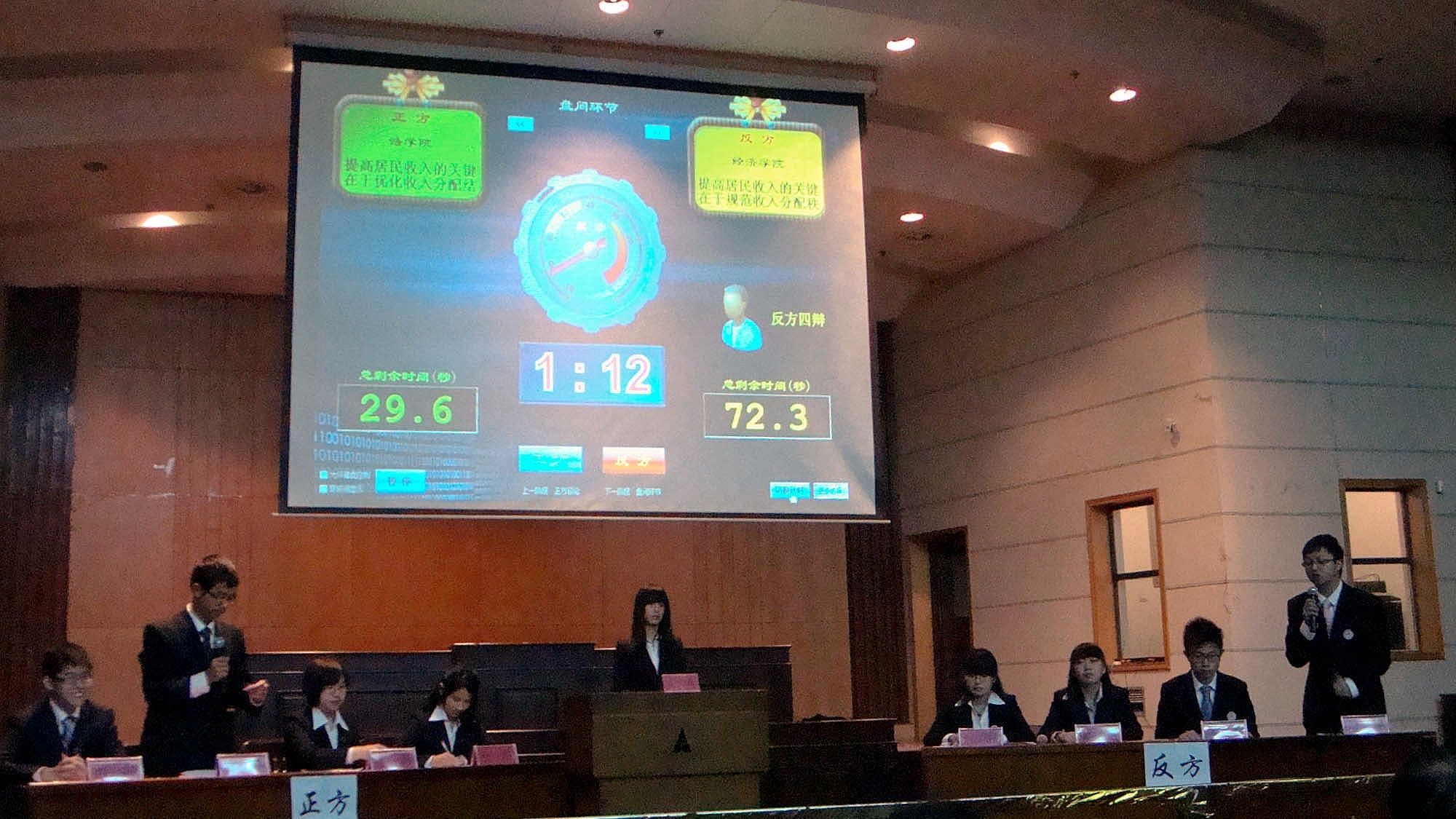辩论正方是法学院代表队,他们的论题是提高居民收入的关键在于优化收入分配结构,他们引据十八大关于收入分配结构的议题,不紧不慢,将自己的观点娓娓道来。将优化结构与规范秩序进行对比,说明优化结构相比较优化秩序的优点。作为反方的经济学院代表队,开明宗义,条分缕析,将正方的论点一一进行辩驳。强调财富分配的合理性,并提出创造财富的生产力缺失,源动力不足,根源在于分配秩序的不合理。呼吁创造整洁有序的分配环境,使人民劳有所得。在而后的自由辩论环节,双方旁征博引、针锋相对、互相反问、精彩迭起,赢得掌声连连。