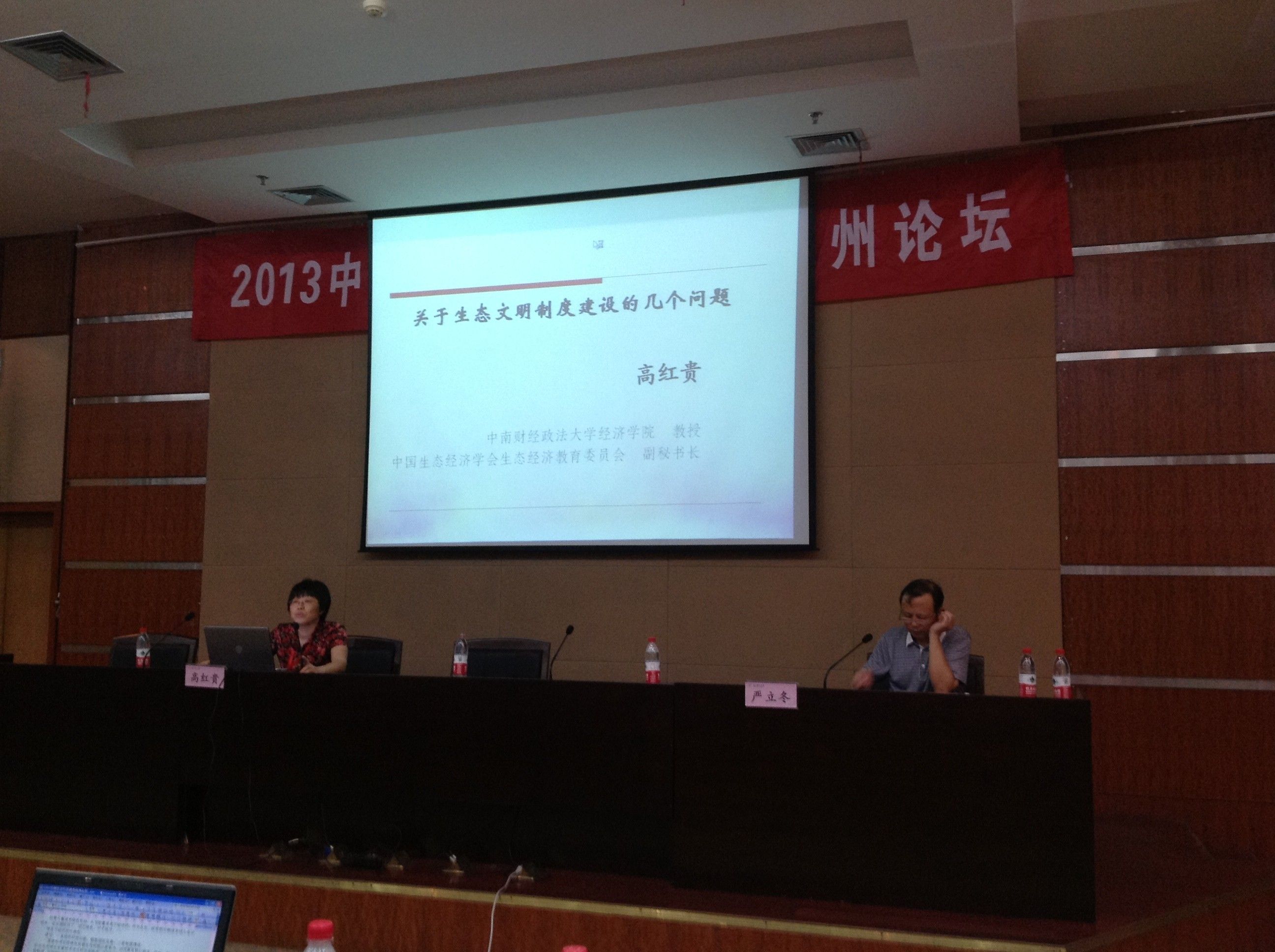 2013年8月17—20日,由中国生态经济学会生态经济教育委员会主办,浙江理工大学经济管理学院和浙江省生态文明研究中心承办的“2013中国生态经济建设﹒杭州论坛”。来自中国社会科学院、中南财经政法大学、华中农业大学、中国地质大学(武汉)、广西大学、江西农业大学、福建师范大学、南京师范大学、浙江理工大学、浙江工商大学等高校、科研院所的100多位学者参加了本次论坛。本次论坛的宗旨是“以建设生态文明为价值取向,发展绿色经济为主题,推进绿色发展为主线,为实现中华民族伟大复兴的中国梦贡献绿色力量。”