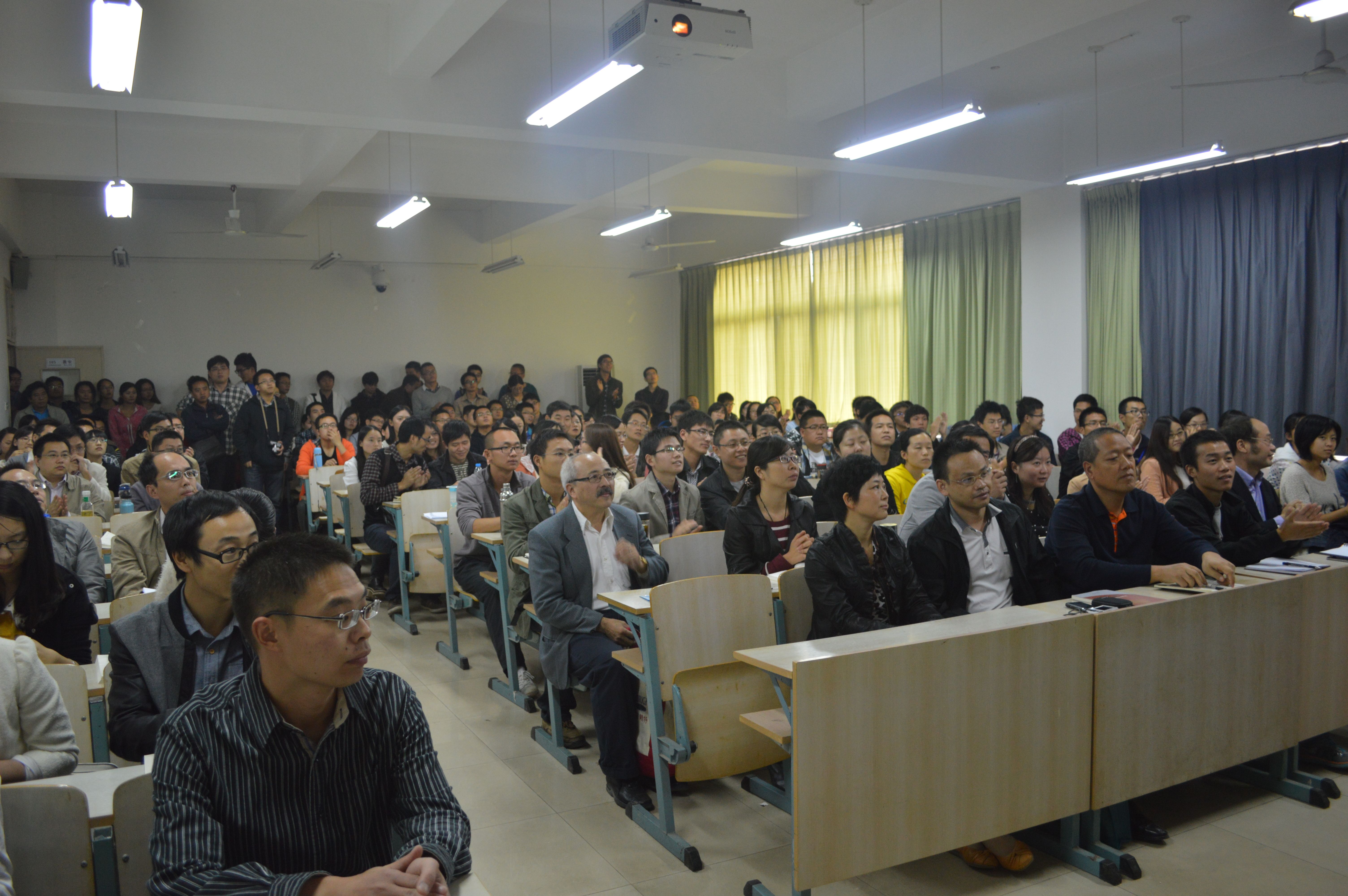 讲演的开始部分,艾春荣教授简短的介绍了计量经济学的产生和它对经济学的巨大贡献,并指出,当前国际在计量经济学模型探讨的比较少,他预测未来计量经济学模型的建立可能成为计量经济学的一个分支。接着艾春荣教授通过五个具体的建模例子来说明了计量经济学的建模方法,并且结合生活实例深入浅出的做了拓展,将深奥难懂的理论经济应用于生活,应用于实践。艾教授的这种教学方得到了广大学者的赞同,会场上不时响起阵阵热烈的掌声,以表示他们对艾春荣教授的认可与尊敬。整个教室洋溢着浓郁的学术氛围,与会学者,众多学子在艾春荣教授的指引下进行了一场经济思想的头脑风暴。