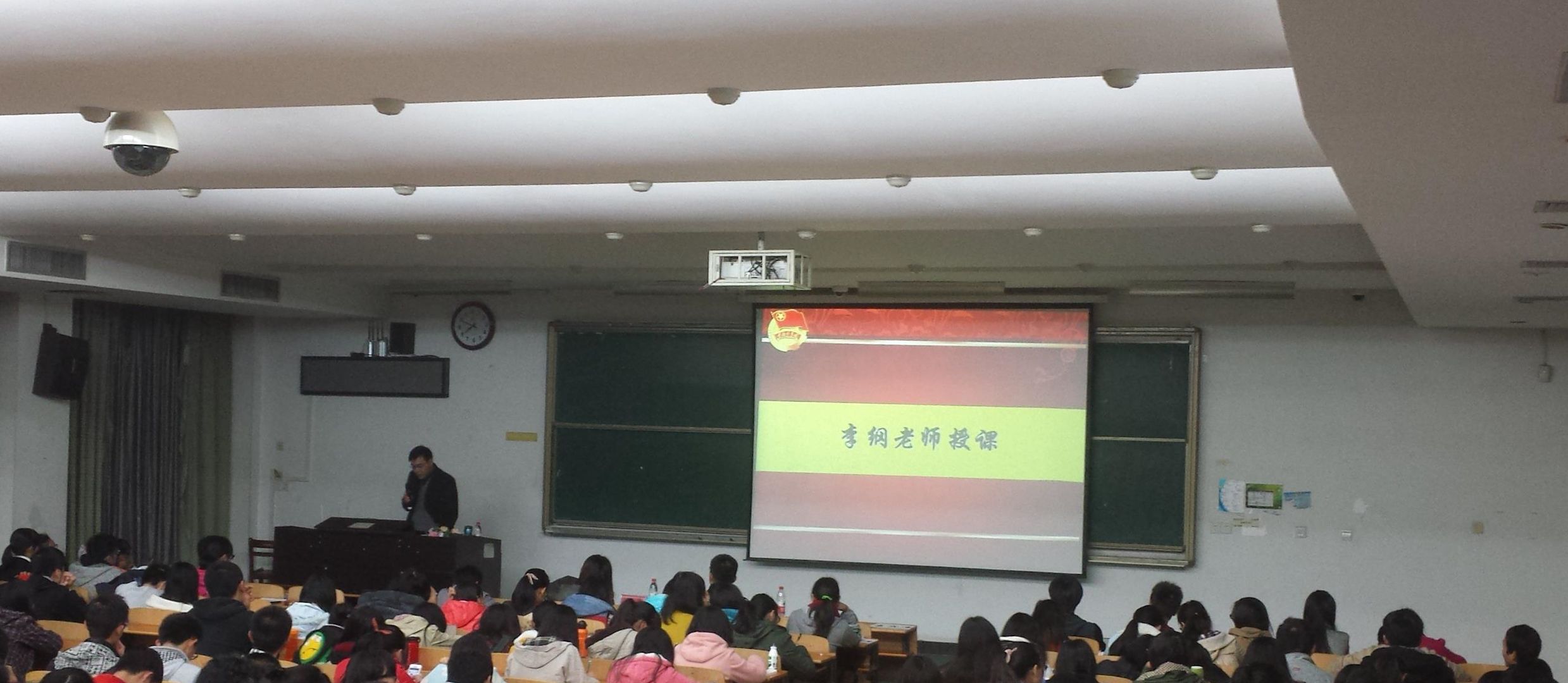 仪式尚未开始,教室里已座无虚席,同学们的参加热情高涨。在齐唱完慷慨激昂的团歌之后,李纲教授引用温家宝总理那句广为人知的“仰望星空,脚踏实地”为本次仪式拉开大幕。授课中,他以个人的大学生活为例,鼓励同学们认真学习,用心思考,要制定合理目标,坚持努力方向,拥有精英意识,怀揣着对国家和民族的责任,在大学阶段培养良好的学习能力,并积极突破专业限制,为更好地实现个人价值打下稳固的基础。