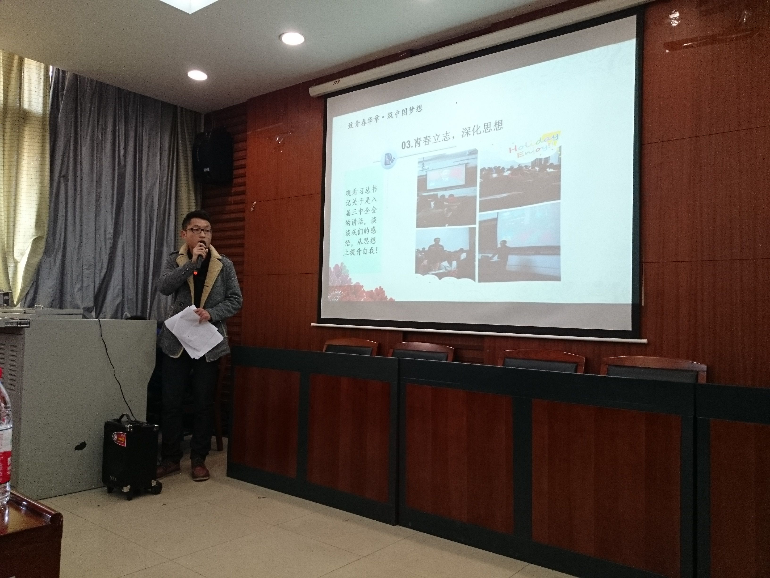——记经济学院团日活动设计大赛展示会 (新闻与网络技术部 郑萍萍 吴宇晗)11月30日上午9点,由经济学院分团委学生会开展的以“致青春华章 筑中国梦想”为主题的团日活动设计大赛展示会于文泉会议室举行,莅临本次展示会嘉宾有校学生会副主席、经济学院分团委学生会副主席张云珂,法学院团委副书记杨耀宁,统数学院团委副书记李启睿,校团委组织部基层工作部副部长王叶帆,校团委宣传册部舆情工作部部长刘警经济学院志愿者协会执行会长吉孟研,经济人报社秘书长罗晓羽以及各学院分团委组织部部长等。 据悉,举办本次大赛的目的是为深入贯彻党的十八大精神,积极响应十八届三中全会的召开,进一步组织引导全院团员青年在实践中理解中国梦,树立青春梦,向“中国梦”注入青春活力。 在简单介绍完来宾之后,展示会在众人的期待下拉开序幕,各班作品形式多样,内容丰富,现场更是掌声不断,首先展示的是经济学院二年级各班的作品,经济4班的爱心包裹项目引来现场一片热议,国商1班的6.5元过一天的新型活动形式更是令人耳目一新,经济3班则将征文,微电影拍摄,义务劳动等活动形式相结合,无论是走上街头做宣传,还是身体力行做尝试,各班的表现都十分优秀;在看过二年级各班的作品后,一年级各班也做了展示,经济3班,经济4班,国商1班都采用开展朗诵比赛及唱红歌比赛的活动形式,但是4班另外还做了社会调查等项目,活动内容更为充实,表现更为充分,而随后展示的国商1班作品则采用了自编自导自演的形式,以觉慧为原型,表现了新一代青年勇于抗争与创新的一面,虽然各班的活动形式各有不同,但是都深入贯彻了党的十八大精神,充分体现了作为新时代青年的青春与活力。 随着时间的流逝,展示会逐渐进入尾声,各班展示结束后,由张云珂师姐对本次展示会中各班的表现做点评,她表示:在全民学习十八大的热潮下,作为共青团员的我们对自身应当有更高的要求,对于团组织如何更加爱护青年,鼓励青年成长;如何发挥桥梁作用,反应青年呼声;如何强化团组织在青年管理和服务中的职责应当有更为明确的认识。经济学院举办这一活动既符合当今共青团工作的要求,又适应青年的特点的优良传统,张云珂师姐也对这一活动给予了高度评价,极大地鼓舞了在场众人。 最后,主持人对本次大赛的相关程序作了说明,大赛将以团日活动开展,材料撰写情况,展示会表现,及加分项(网络投票)四方面为评分项目,让我们期待各班的优秀表现,同时也希望每一位同学都能在本次活动中深刻理解“中国梦”的意义。 |