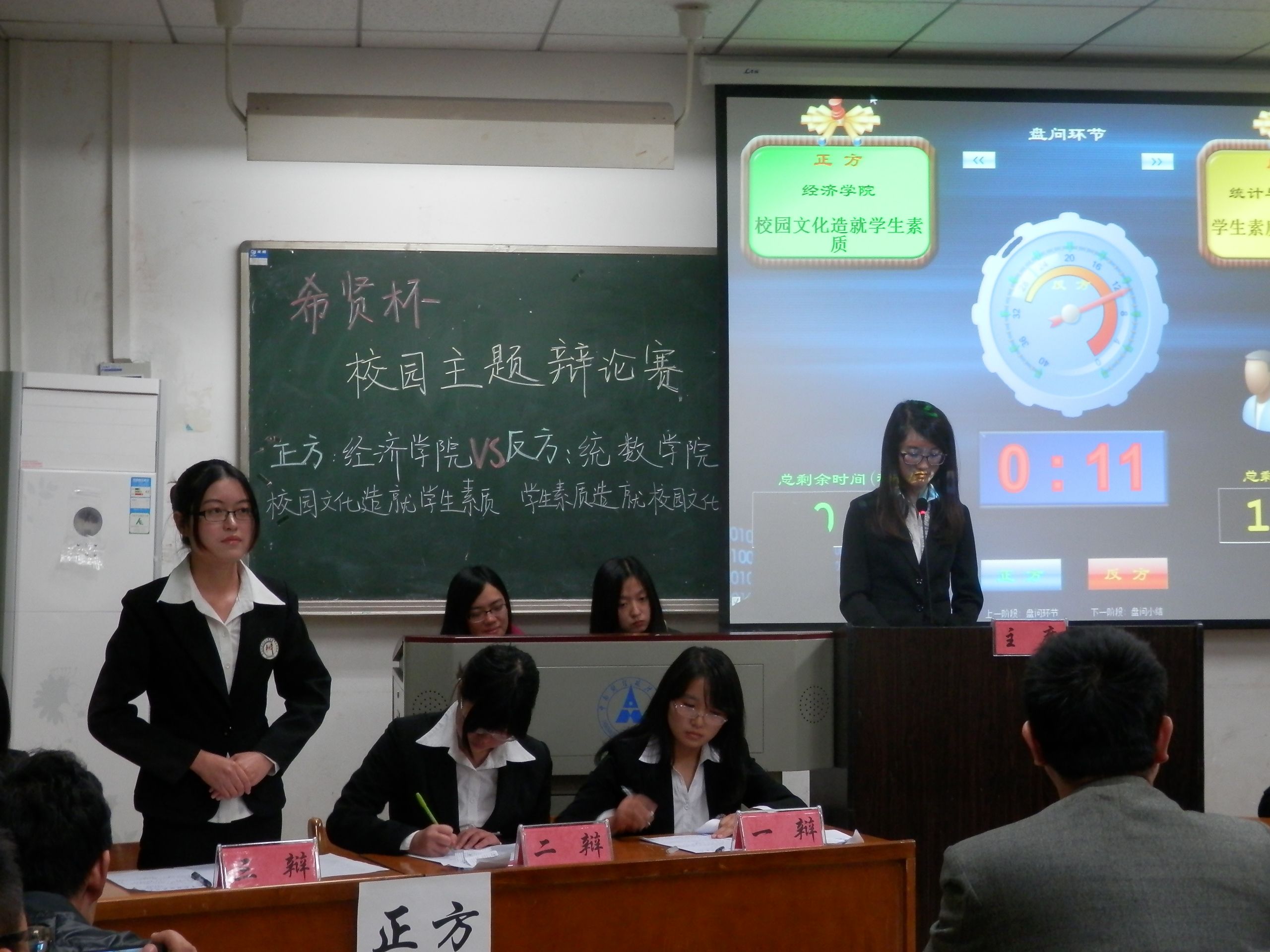 接下来为驳论环节。所谓驳论,即通过揭露和驳斥对方错误的论点来确立自己的论点,由双方二辩来完成。两位辩手都紧抓对方在立论环节时的漏洞,针锋相对。可以看出双方在“学校教育理念的引导与学生个体的主观能动性在建设校园文化时的关系”及“丰富与发展是否就是造就”等问题上存在较大分歧。第三环节为盘问环节,即对对方进行挑战性的询问。问方40秒时间,答方80秒时间,正反双方各有两次盘问机会。在这次正面交锋中双方辩手都毫不示弱,试图将对方逼进逻辑的“死胡同”。面对反方一个个尖锐的问题,我院辩手沉着冷静,用敏捷的思维巧妙应对。四轮盘问结束后进入全场最激烈的自由辩环节。我院辩手通过列举同为常青藤学校,但哈佛大学学生擅长演讲的语言艺术,麻省理工学生却擅长缜密的逻辑推理的例子来论证不同的校园文化造就了学生不同的素质,而反方以社团文化为例坚持认为学生素质造就了校园文化;正方否认反方片面将社团文化看作校园文化的逻辑,反方同样否认正方的论据,认为是本身具有某种素质的学生汇聚在一起才形成了某种校园文化氛围。双方紧扣对方的矛盾节点,向对方展开强大攻势。自由辩环节结束,由双方四辩在四分钟内总结己方陈辞,梳理本场辩论的思路,进行最后的论述。