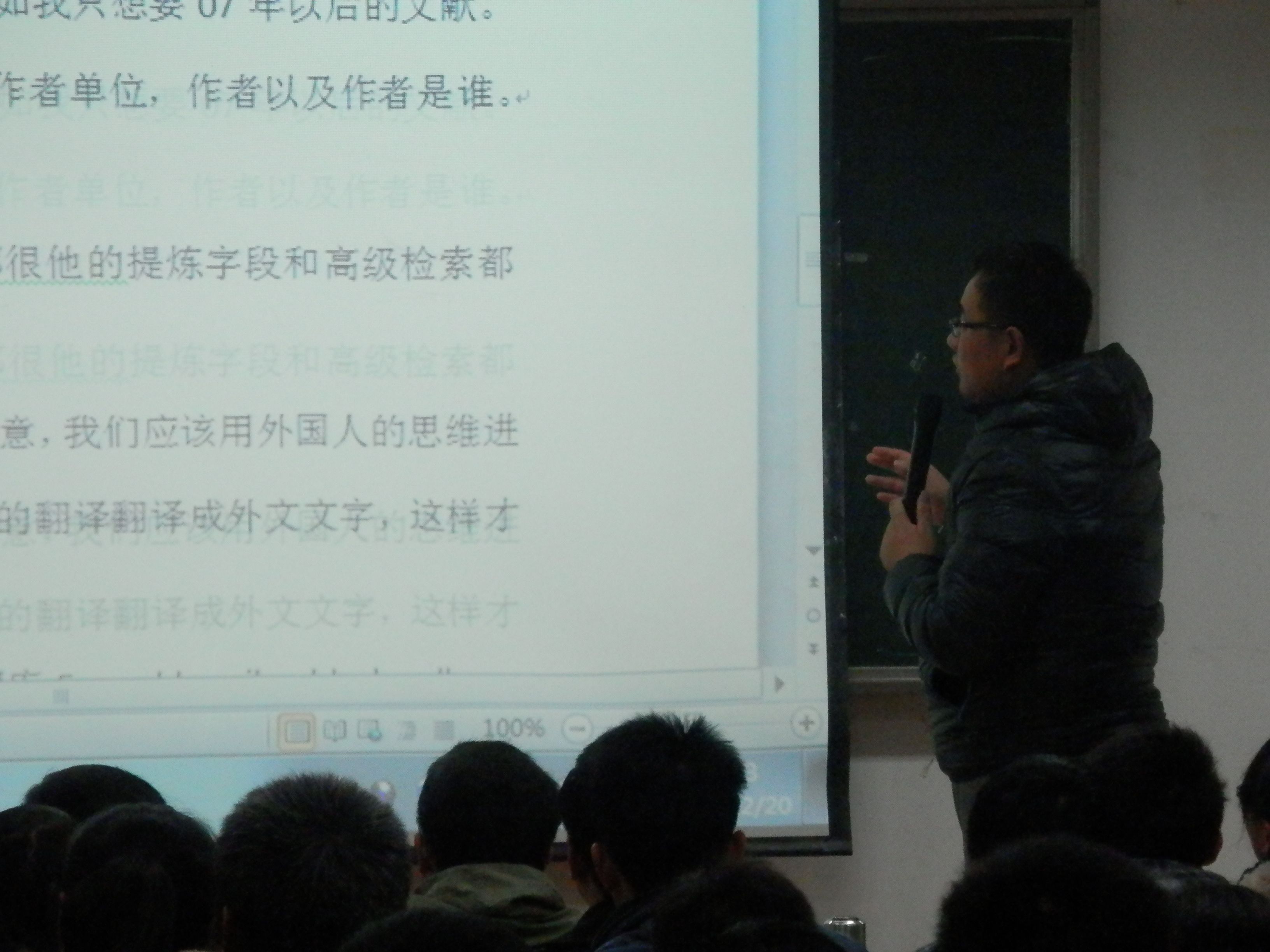 首先由在2013年暑期社会实践中获省级社会实践奖项的马超同学上台演讲。马超主要就如何进行非立项调研和文献的检索与同学们进行了交流。他从一个完整的社会实践的流程出发,讲解了每一个流程。从选题,到组队,到实地调研,再到最后的整理资料,和最终答辩,他详细地介绍了每一个步骤和其中需要注意的细节。马超结合自己的经历,表达了自己对社会实践的看法:做社会实践要忍住寂寞,重视细节,才能做出成绩,得到结果。最后,他重点介绍了文献检索的方法与技巧,向同学们推荐了数个专业文献数据库,并回答了同学们的提问。