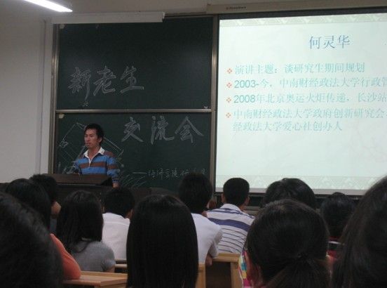 本次交流会我们分别邀请了学校不同院系的优秀学生代表,他们分别是公共管理学院行政管理专业2007级硕士研究生何灵华同学、法学院国际法专业2007级硕士研究生张宏伟同学、经济学院西方经济学专业2008级硕士王鹏同学、经济学院西方经济学专业2007级硕士方宇惟同学以及我校信息学院统计学专业博士张学新,他们深入浅出的演讲系统而又详尽地讲述了在学习、就业、考博、兼职、实习中所需要注意的问题,给我们提出了很多有意义的建议,对新生同学的学习生活有很大的帮助。