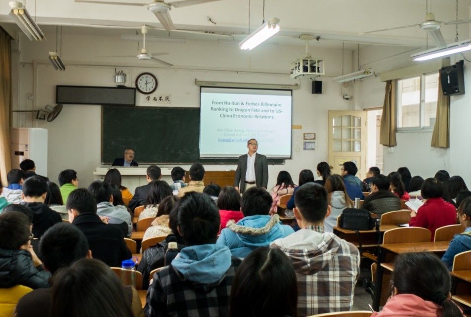 讲座开始前,金应华老师首先简要介绍了黄维乔教授的学术成就和学术地位,接着用幽默的例子引入所讲的主题,在场的同学热情高涨,掌声连连。随后,黄教授开始讲授。黄教授首先简述了自己在各国游学的经历,以及工作的经历,着重讲述了自己如何结合实际选择自己所感兴趣的研究领域。然后黄教授自然进入本次讲座的主题——“From Hu Run & Forbes Billionaire Ranking to Dragon Fate and to US-China Economic Relations”。黄教授根据“胡润百富榜”所公布的数据和有趣的发现提出了自己的思考:属相是龙的人群是否在财富榜上拥有更好的运气。然后针对此问题,讲述了自己的实证研究的结论。在对此问题进行启发性的讲述后,黄教授针对中美关系的问题阐述了自己的独特的见解,尤其是针对中国与美国之间的利益对抗进行了深入分析,得出“中国与美国是相互依存的关系,需要相互促进”的结论。