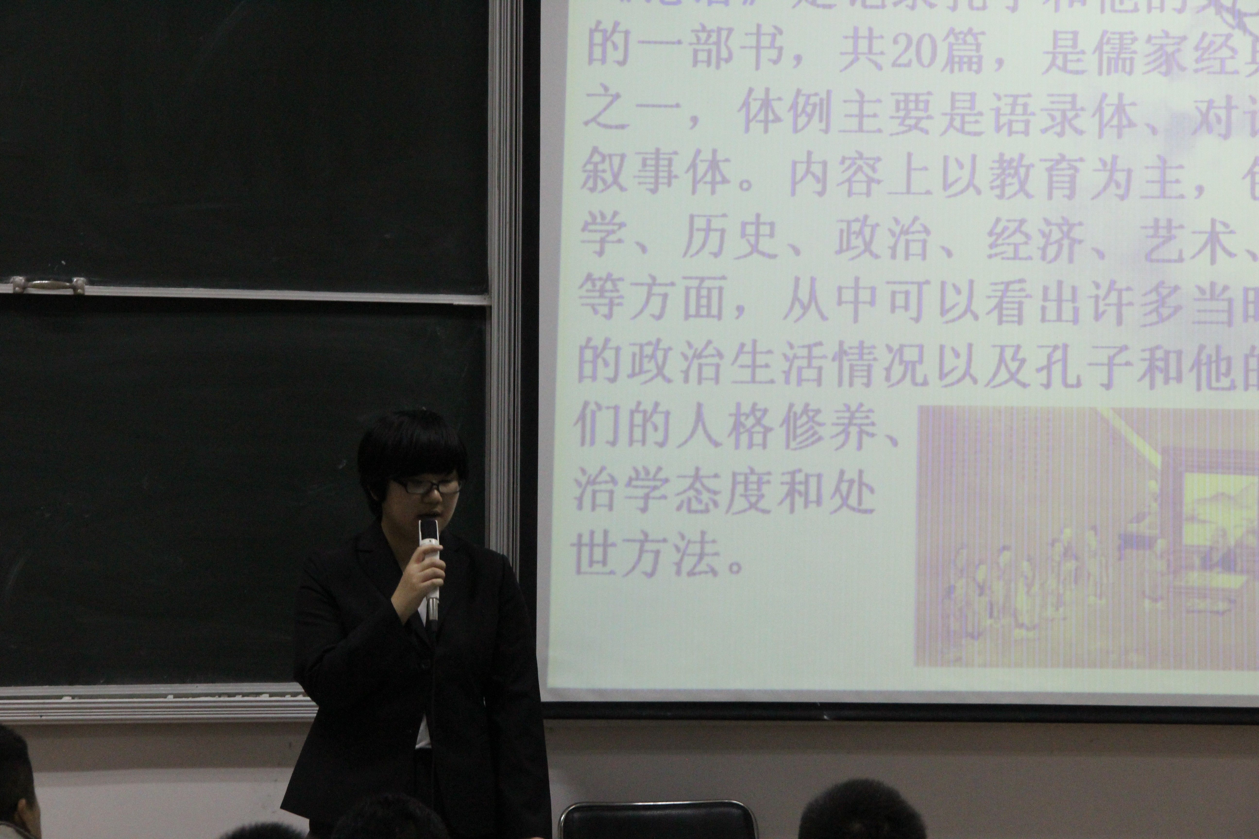 接下来经济1301班的李文然同学跟大家分享了她读《论语》的体会。她从对孔子的介绍引入对其作品《论语》的赏析,并摘取了《论语》中几段经典对话谈自己对论语的看法与对孔子的评价。她个人认为,孔子是一个普普通通喜欢思考、善于思考的学者而并不是圣人,需要我们用一颗平常心去对待,不要将人物夸张化。针对她的看法,现场的同学们也进行了热烈的讨论。