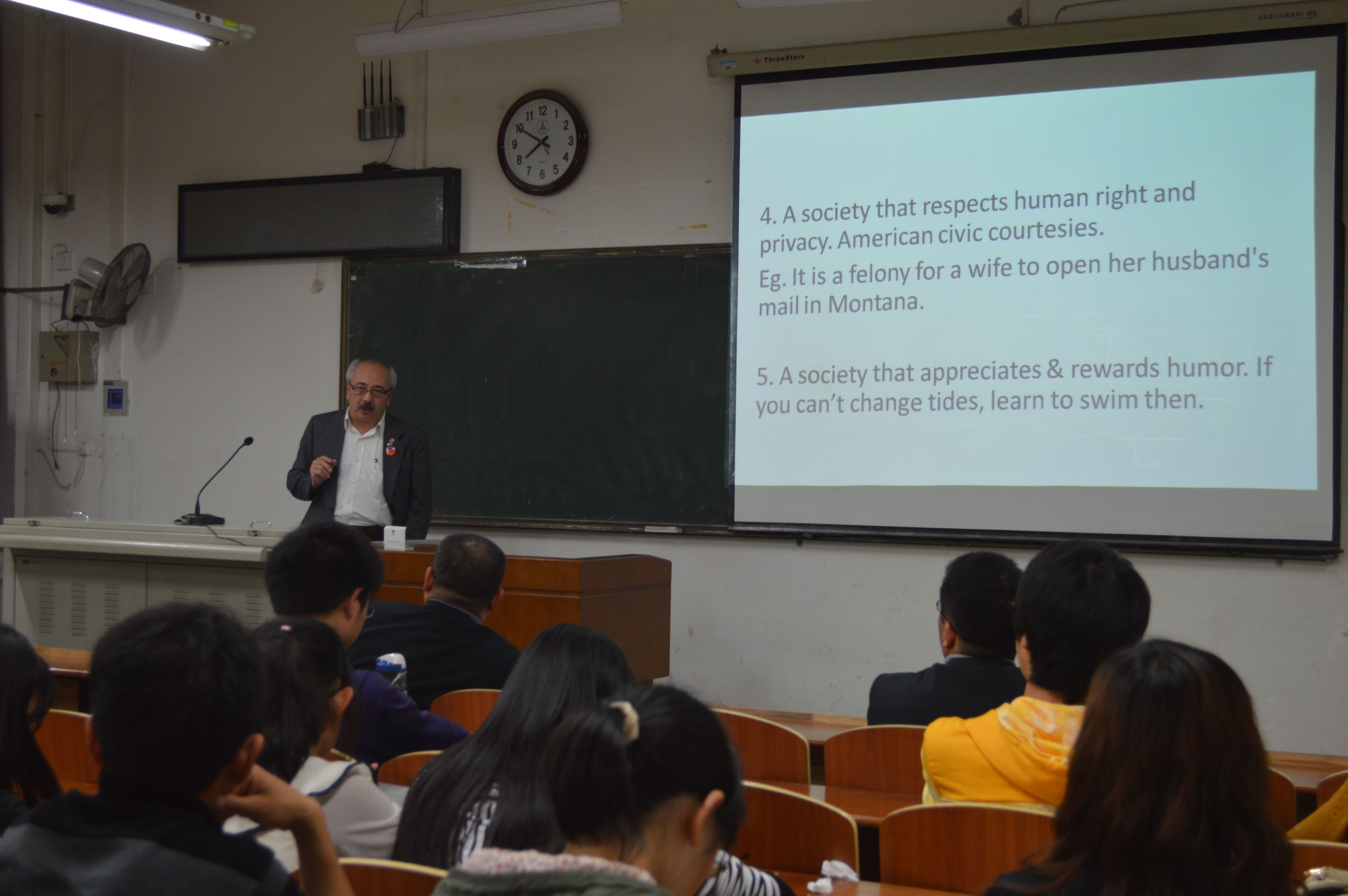接着,黄维乔教授又从另一方面为大家讲述了美国人国民性格中的一些缺憾和黑暗面。比如极大地崇尚个人主义和自我成功,以及这些因素所导致的美国社会关系中的冷漠自私和人与人之间人情味的缺失;美国人直爽的性格导致的他们对文化差异和文化敏感的忽视;美国人天生的傲慢,霸道以及控制欲所构成的美国霸权主义的国民性格基础。主讲人从细节出发,客观地为听众们描绘了一个有血有肉的美国社会,启发了同学们更多的思考。