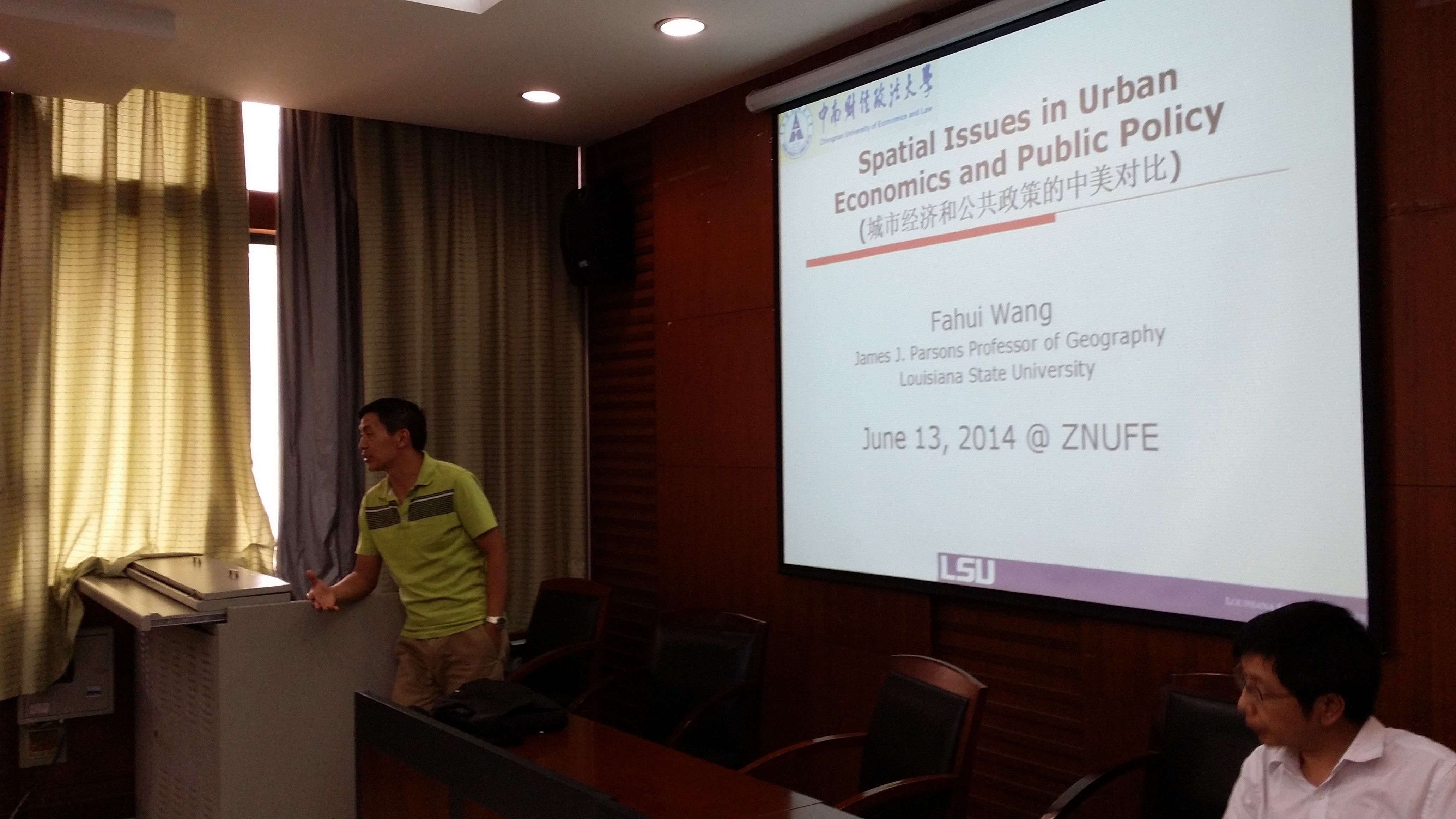 2014年6月13日下午2:30,来自路易斯安那州立大学地理与人类学系教授、系主任王法辉教授,应邀为我校师生做了一场以“城市经济与公共政策的中美对比”为主题的精彩讲座。此次讲座由经济学院主办,经济学院院长、博士生导师邹进文教授主持,经济学院副院长罗良文教授、胡雪萍教授、项本武教授、杨艳红、马强文等老师以及工商学院部分老师出席参加。同时,来自学校各年级的本科生、研究生同聚文泉楼经济学院会议室,享受了这场学术的视听盛宴。