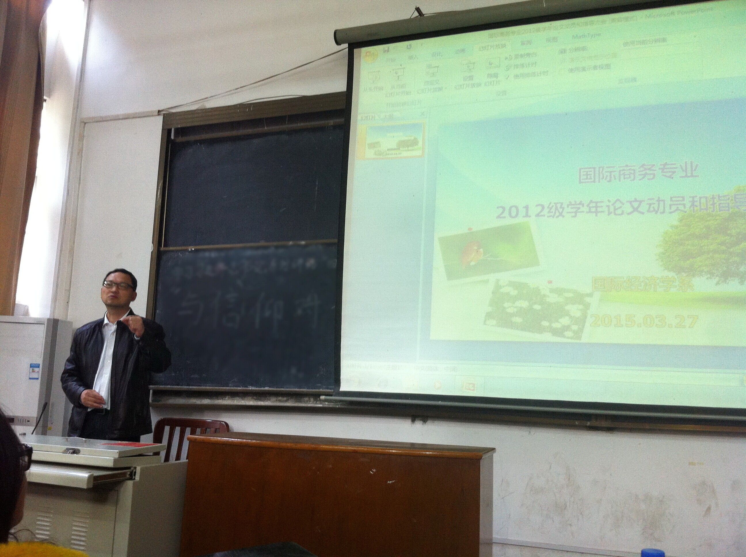 为了让学生们更好更规范地完成学年论文,指导学生写论文,解答学生论文写作过程中常见的问题,按照李小平副院长的指示,由班主任孟庆红老师安排,国际经济学系组织了“国际商务专业2012级学年论文写作动员指导交流大会”,该大会于327日下午1400在电教楼101教室顺利召开。