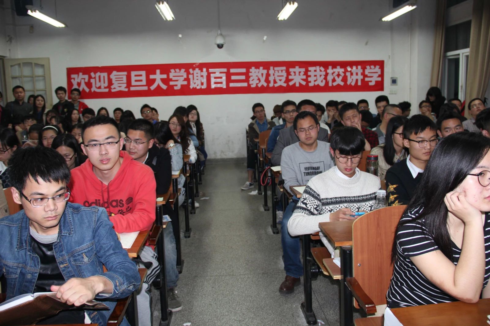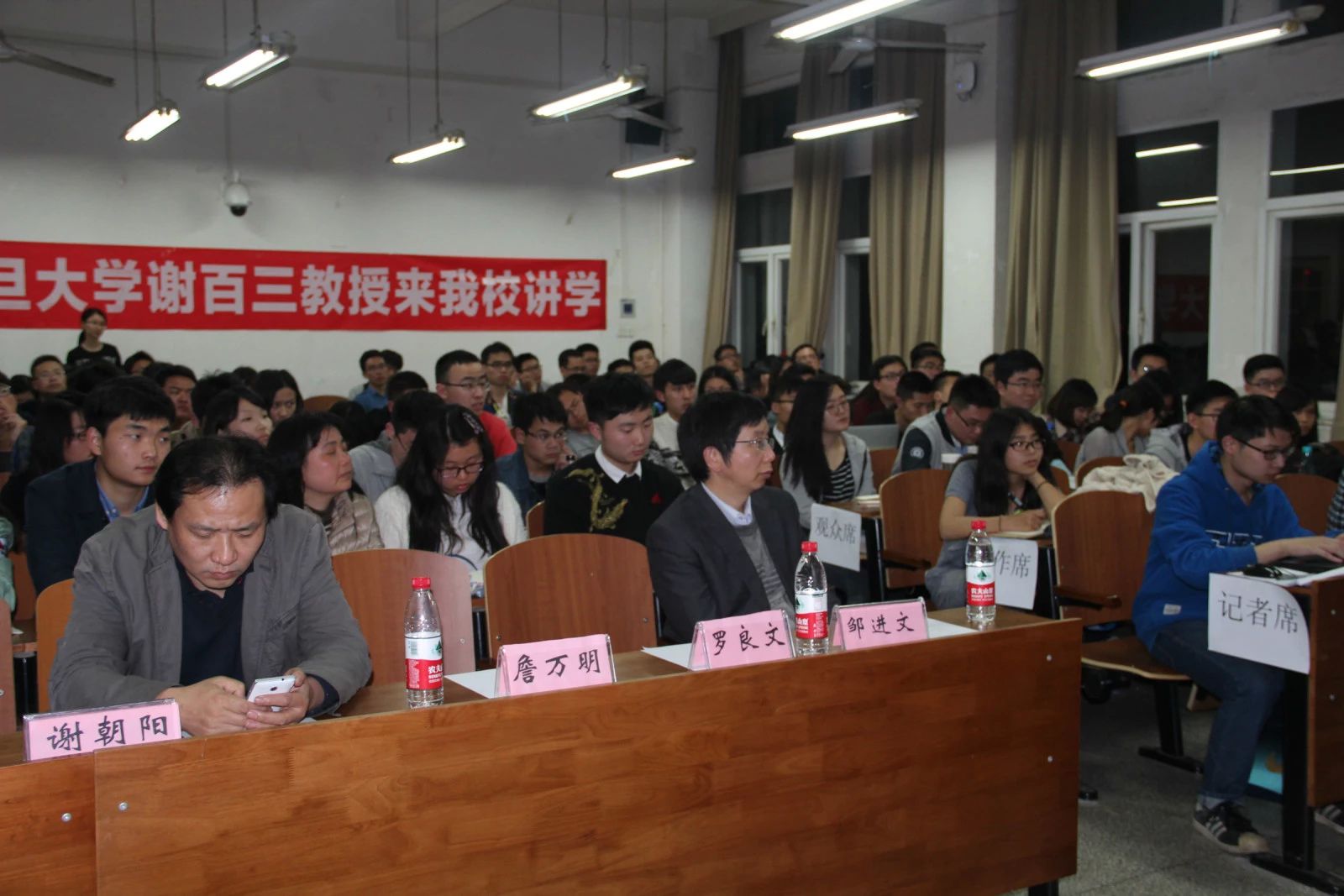 (新闻与网络技术部 单俊俊 赵成翔)2015 年 4月16日,由复旦大学金融与资本市场研究中心主任、复旦大学管理学院教授、博士生导师谢百三教授主讲的,以“同是一片天地,改革开放30年来何以有人千万富翁有人家徒四壁——分析贫富差别的个人原因,兼谈当前的股市”为主题的学术讲座在文澜楼209教室成功举办。本次讲座由乐鱼官方端网站登录入口主办,经济学院分团委学生会承办。经济学院院长邹进文教授、副院长罗良文教授、党委副书记詹万明老师、党政办主任谢朝阳老师莅临讲座现场,本次讲座还吸引了来自多个学院各个年级的一百多位同学,整个教室熙熙攘攘,许多人都是站着在听讲座。