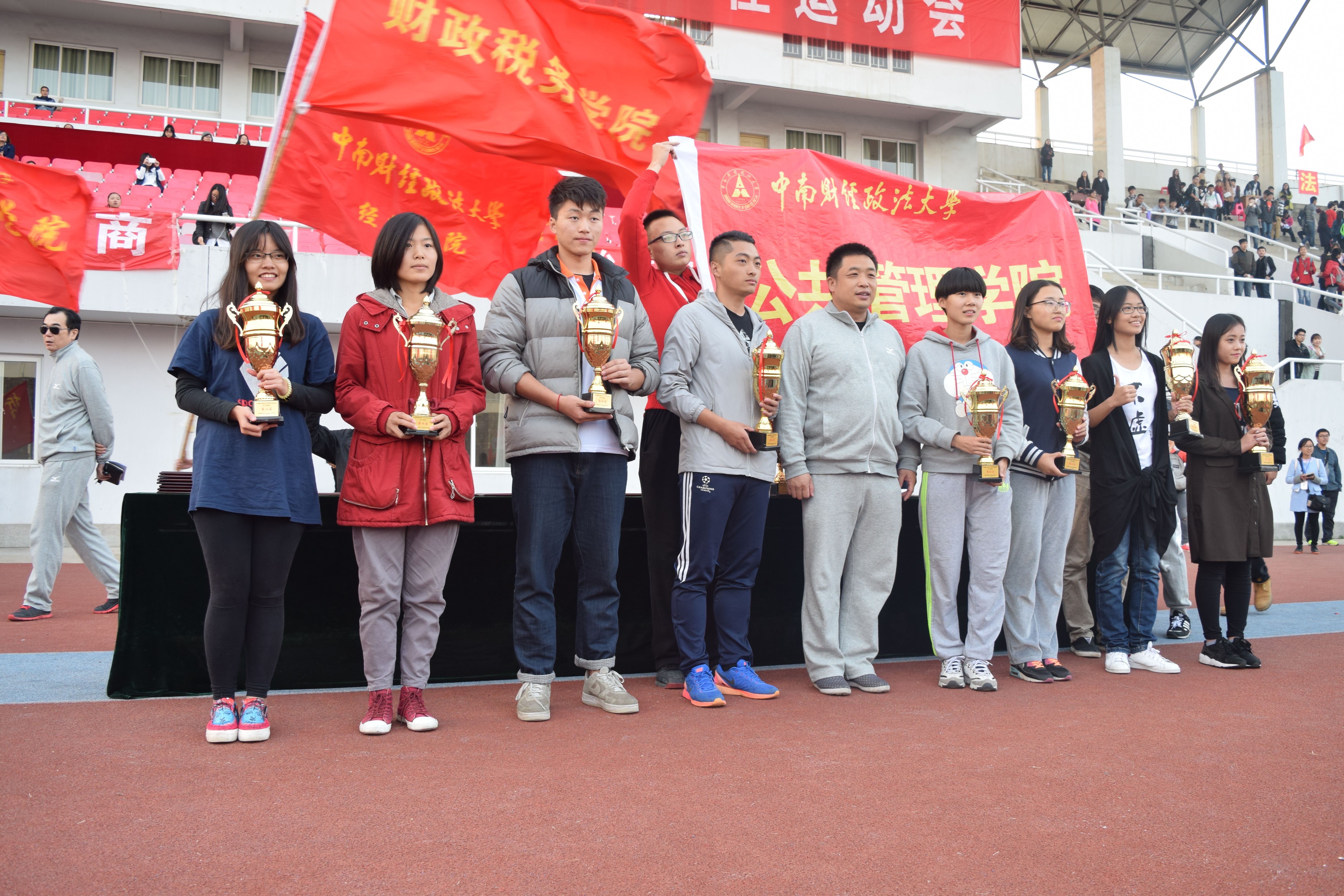 (新闻与网络技术部 单俊俊 刘畅)2015年11月1日,历时3天的中南财经政法大学2015年田径运动会在新体育场圆满落幕。中南财经政法大学团委李司铎副书记、体育部吴正华主任、周晓东副主任以及刘少兵裁判长莅临本次闭幕式。 下午4时许,伴随着拔河项目的结束,各学院代表队在主席台前井然有序地排列成一个个的方队。微风习习,各学院领队手中的红旗在蓝天下迎风飘扬;持续不断的隆隆鼓声让同学们热血沸腾,看台上传来一阵阵呐喊欢呼的声音,无不表露着其心中的激情与骄傲。经济学院的运动健儿们神采奕奕,他们身着的白色院服和草地相称成为所有方阵中一道最亮丽的风景线。 大会第一项,运动会总裁判长刘少兵向全体人员宣读了比赛成绩。随后李司铎副书记宣读了本届田径运动会的“体育道德风尚奖”获奖单位,激动人心的颁奖典礼旋即开始。在主持人的指挥下,各院代表依次入场,由主席台上的四位领导分别为男子团体前八、女子团体前八以及综合团体前八的学院代表颁奖。经济学院获得了男子团体第六、女子团体第七、综合团体第六的好成绩,并斩获“体育道德风尚奖”。比赛重在参与,有付出就一定有收获;奖杯是对运动员们的不懈拼搏的肯定,也是对他们的不肯言弃精神的赞赏!