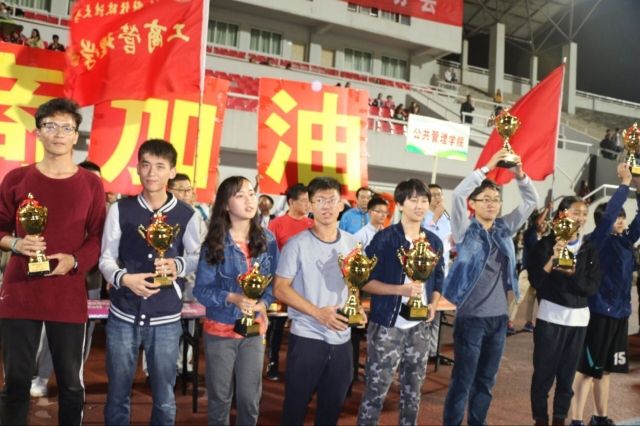 (新闻与网络技术部薛阳 任明喆)2016年10月21日晚6点,历时两天的中南财经政法大学2016年田径运动会在南湖校区新体育场圆满落幕。伴随着拔河项目的结束,各学院代表队在主席台前井然有序地排列成一个个的方队。经济学院的运动健儿们神采奕奕,领队手中的红旗迎风飘展,成为整个方阵中一道亮丽的风景线。