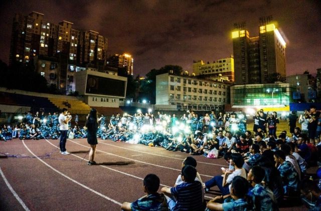 平日严厉军助此时眼里柔情似水,一曲《神话》唱出了她们对鸳鸯双栖蝶双飞的希冀。之后二团六营的薛营长也自信地举起了话筒。“你会看到我的爱,在旗帜上飘扬……”当薛教官一曲终了,现场爆发的又何止是掌声。黑暗中反光的,那是千行泪啊。15天来的陪伴与付出,一次次呵斥,一次次叮嘱,乐莫乐,温柔与坚毅并存;念莫念,欢乐与泪水共生。音响唱坏了嗓子,默默无语,同学们收拾好心情,依旧那么有序地排好队伍。