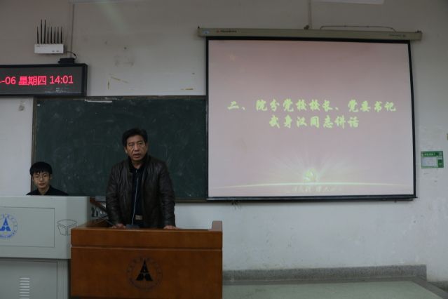 紧接着,经济学院分党校校长、党委书记武身汉为本次开学典礼致辞。首先他讲到,在从严治党的背景下,治党是纲,治党是本,从严治党是新时期推进“四个全面”的要求之一,只有把党治好,才能建设好党领导的中国特色社会主义事业。随后,他指明了党校发展的新常态——无论是党外的积极分子、发展对象、预备党员还是党内人员,都应该了解党的路线、政策、历史等基本知识,在党校不断学习以提升思想觉悟水平,这也是我院本期党校开办的起点。同时,他也指出党校的教育要与时俱进,注重结合马克思主义中国化的探索,总结十八大以来中国共产党的实践成果和经验,并引导同学们保持理论自信、道路自信、制度自信以及文化自信。讲话最后,他表达了对同学们的殷切期望,希望大家在在课堂内外相互帮助、相互学习,最终通过党课而有所学、有所得、有所悟、有所行。