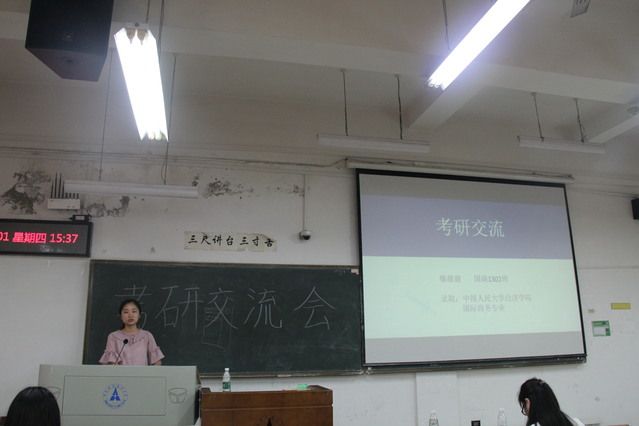 接下来进行分享的是,以355分考研至中国人民大学国际商务专业的柴甜甜同学。她首先向同学们介绍了一些考研相关的信息和知识,接下来也是同上一位嘉宾一样,向大家介绍自己备考的经历。当说起自己为何选择中国人民大学为目标时,柴甜甜用十分坚定的语气说道:“我当时觉得,我要考研就一定要考最好的!当我知道人大的国际商务排名全国第一时,我就下决心一定要考进去!”这铿将有力的一句话,给了在座的同学莫大的激励。而后,柴甜甜同学还分享了自己考研时遇到的趣事,一下子拉近了与同学们的距离。