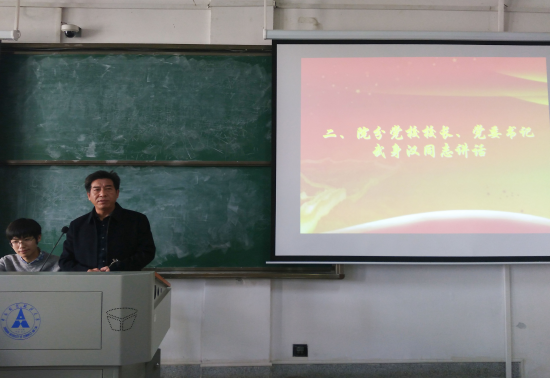 首先,出席本次开班典礼的全体老师与同学起立奏唱国歌。接着,院分党校校长、党委书记武身汉老师发表讲话。武书记首先说明了开办此次党课的目的,开办此次党课旨在壮大经济学院预备党员与入党积极分子的队伍,贯彻党的基本路线和方针政策,提高同学们的政治素养,为加强基层党组织建设服务。