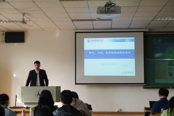 随后,刘璐同学向同学们介绍了拥有丰富参赛经验的经济1402班李萌同学。关于自己对“博文”“大创”“社会实践”的见解,李萌同学将其分为是什么、为什么、怎么做三个问题。在对本次指导会三项主要内容进行简短的介绍后,李萌同学就三者的区别向台下同学们提出疑问,并在同学们回答的基础上透过本质得出结论,加深同学们对三者的理解。而后,李萌同学以他自身参与“挑战杯”进行立项调查为例,向同学们剖析了自己提出的三个问题,赢得同学们的一片掌声。
