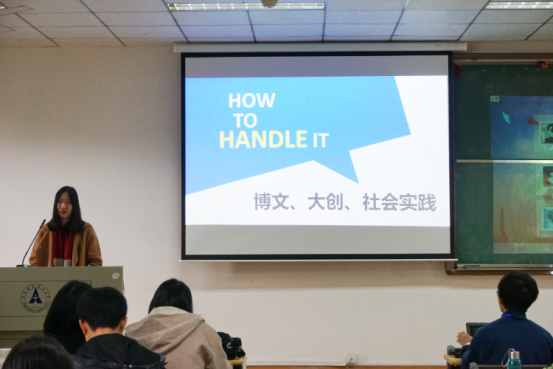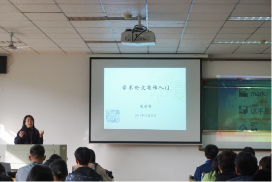 首先,创业实践部干事刘璐同学对“博文杯”“大创”“社会实践”进行了简明扼要的介绍,让同学们对三者的大致内容有一个初步的了解。而后,在同学们热烈的鼓掌声中,第一位嘉宾宋丽智老师上台对同学们进行学术论文写作入门指导。宋丽智老师开门见山地提出论文写作能力的重要性,强调“论文写作能力是本科生重要的素质”,并从五个方面对此进行阐述,引起同学们对论文写作的关注。接着,宋丽智老师从论文写作的基础、如何选题、如何查找文献数据、论文结构、如何遵守学术规范、什么是优秀的学年论文等六个方面介绍了写一篇优秀论文的技巧,并结合往届本科生、硕士生的论文样板对于所讲论文格式进行了具体的分析。