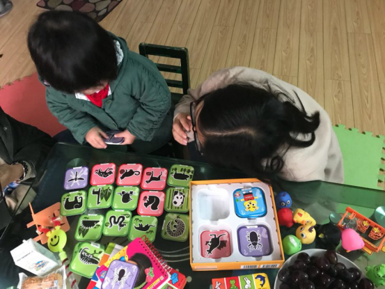 上午9点,志愿者们顺利到达艺萌听力康复中心儿童小贝的家中,由于是初次见面,小贝显得有些怕生,躲在妈妈的身后,怯怯地望着志愿者们。得知小贝喜欢拍照片,志愿者们灵机一动,用美图秀秀的特殊小动物头套拍照功能,一边拍照,一边教小贝小动物的名称。过了一会儿,小贝渐渐与志愿者们熟络起来,主动拿出了玩具,和志愿者们一起玩。志愿者们利用3D动物卡片,给小贝介绍不同动物的特点,俨然是一堂生动有趣的“动物世界”课堂。