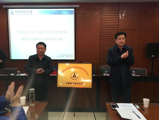 随后,杨灿明校长和尹汉宁教授热情地为中国特色社会主义政治经济学研究中心揭牌,该中心是2017年7月批准成立的。