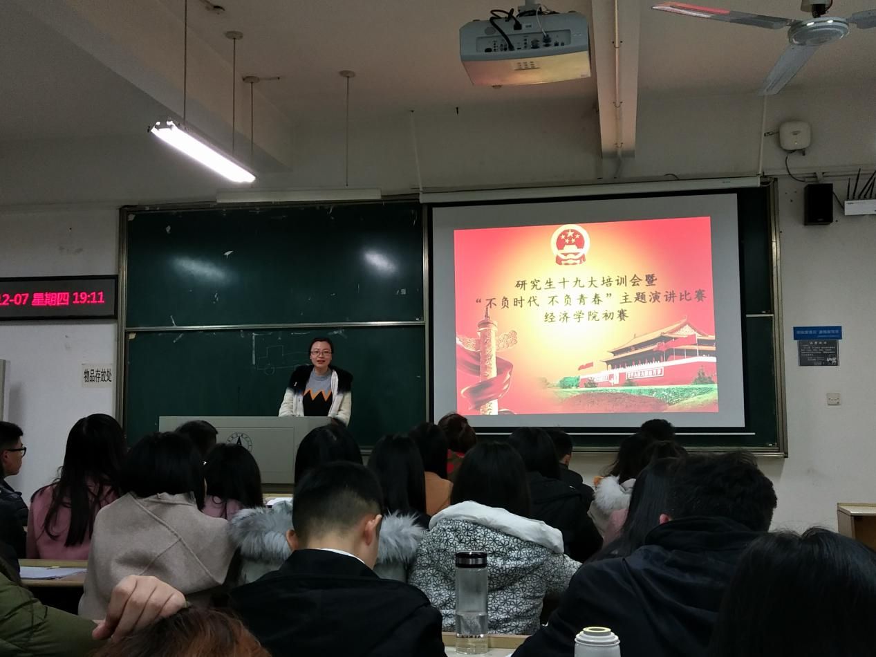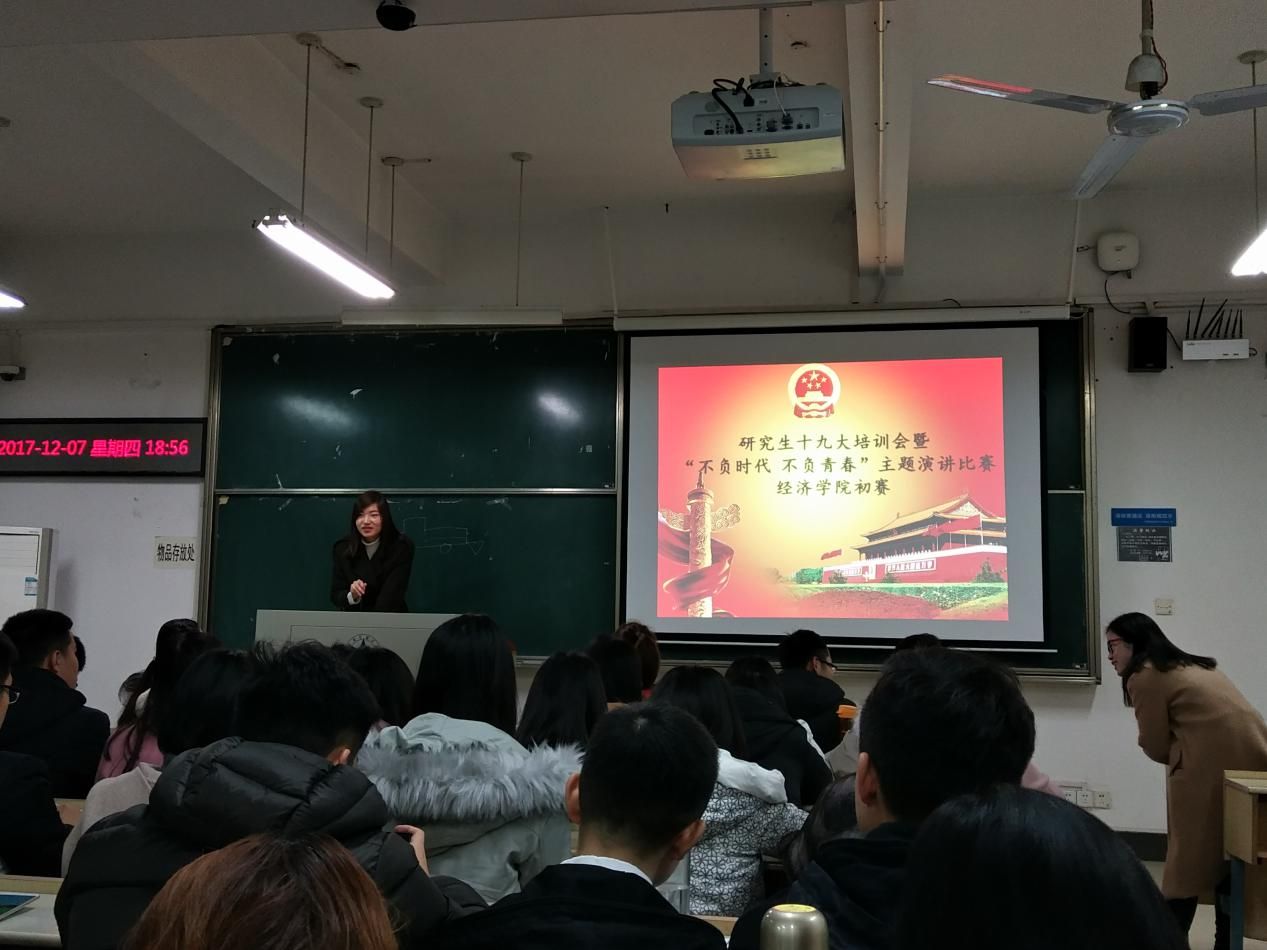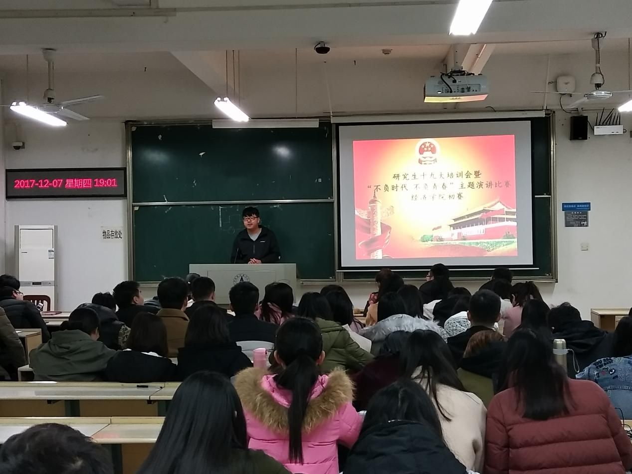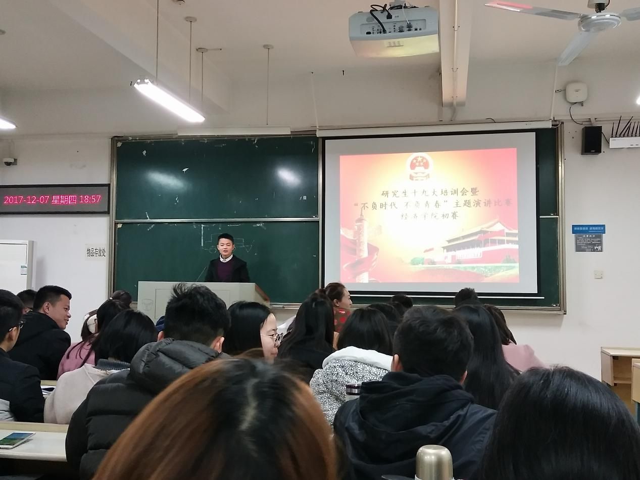 2017年12月8日下午7时,乐鱼官方端网站登录入口于文添楼102教室展开了研究生十九大系列学习活动“不负青春 不负时代”主题演讲比赛(经济学院初赛)。研究生辅导员岳明泽老师,2017级全体研究生以及经济学院研究生会全体成员参与了此次活动。