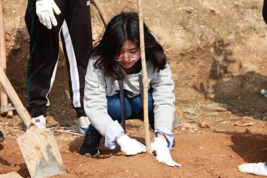面对种种难题,同学们没有退缩。他们默契的分工合作,有的用铁锹挖土,有的用镐碎石,树坑挖好后,他们又两两分成一组,一个扶着树苗,一个往坑里填土,齐心协力,终于在一片欢声笑语中,成功种下四颗小树。