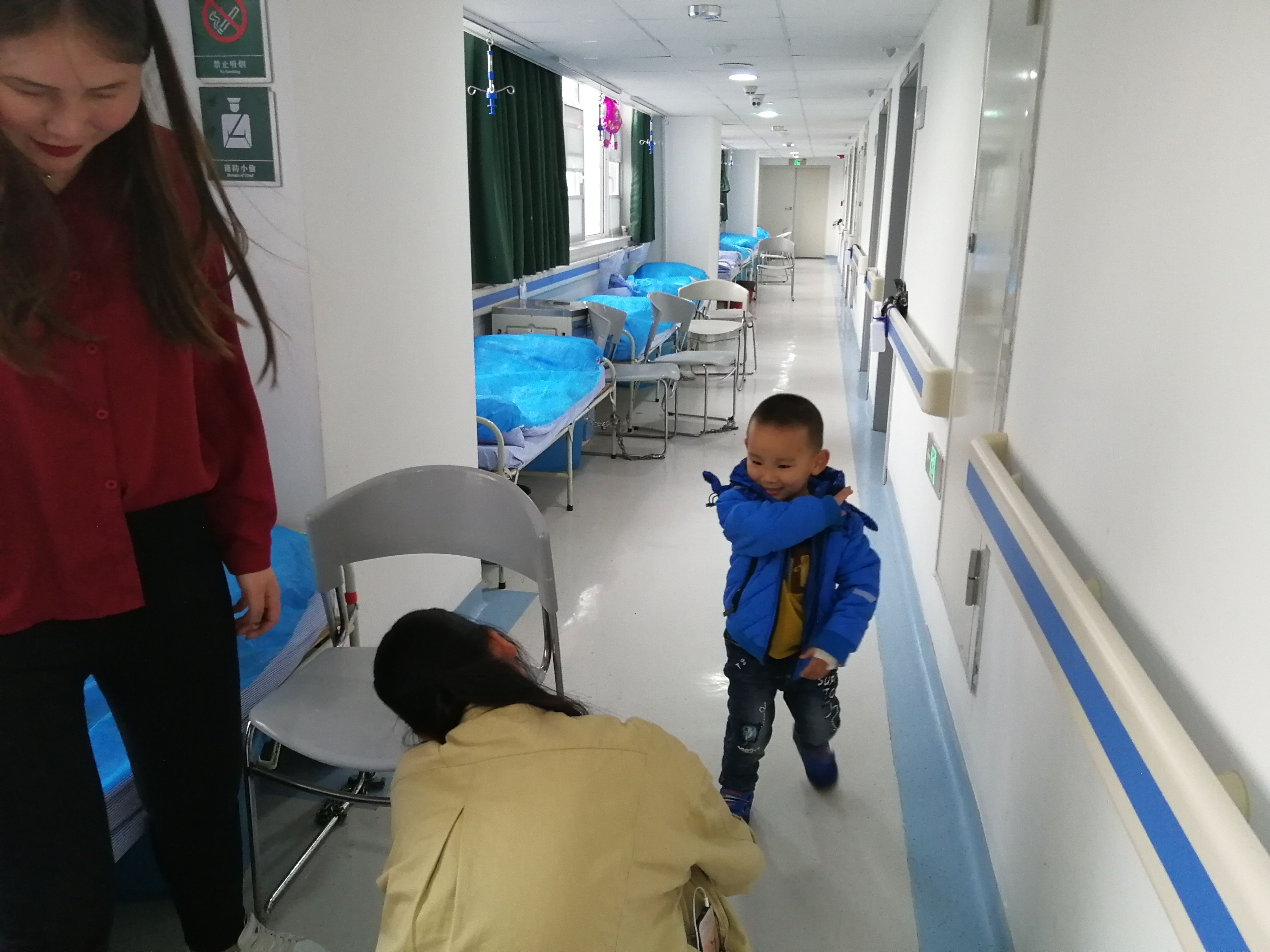 (图1:小朋友们和志愿者在医院走廊做游戏)