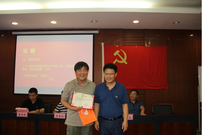 (院党委书记武身汉同志为中南财经政法大学第一届“支部好案例”获奖者颁奖)