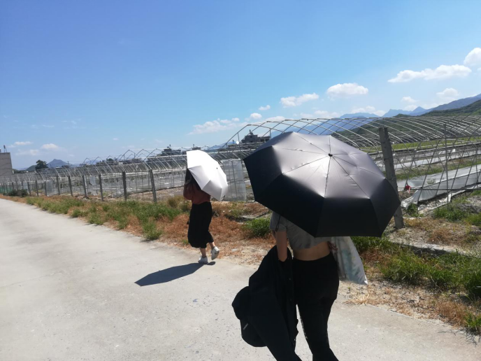 下午,实践小组到达通城县兴龙生态农产品公司河塅金丝菊基地观察当地金丝菊生长情况。正值暑月,金丝菊还未开花,漫山遍野望去,之间公路两旁尽是接连不断的大棚和连片的绿色稻田。公司负责人带领实践团队成员参观了当地的金丝菊基地,小组分为三队分别进入基地内部、基地沿边和基地旁的种植户参观访谈。分组访谈结束后,实践团队得知在菊花产业方面,政府提供物资扶持、技术扶持、政策扶持和产业扶持,公司打通收购和营销渠道,扶贫效果显著。
