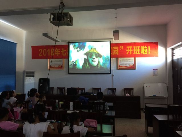 午休之后,志愿者们为孩子们播放了教育型电影《功夫熊猫3》。由于当地音响存在技术故障问题,电影仅能靠电脑自带音响播放,声音较小。令志愿者们欣慰的是,孩子们没有了平时的打闹嬉戏,整个教室除了不时的欢声笑语之外便只剩下电影播放的声音了。