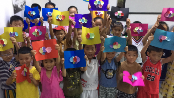 下午,经过了漫长的准备工作,队员们与小朋友们一起手工制作了花朵感恩卡。小朋友们小心翼翼地将彩色卡纸对齐、折好,并用固体胶粘上彩色花朵。还有的小朋友在做好的感恩卡上画画,写上感恩的话语,想要在下课的时候送给妈妈,给妈妈一个小惊喜。捧着精心制作的感恩卡,小朋友们的脸上是满满的笑意。