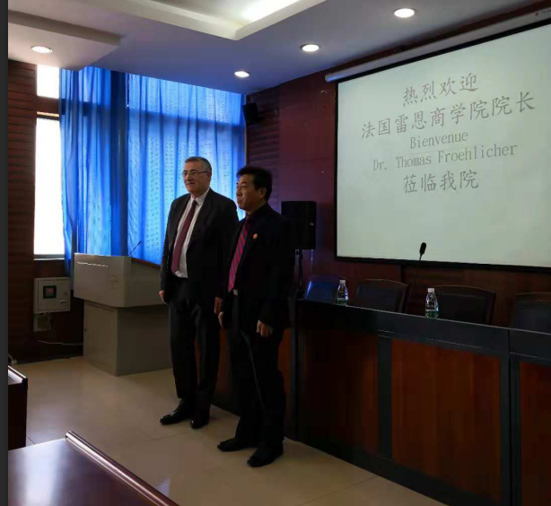 10月27日上午,法国雷恩商学院院长Thomas Froehlicher先生在参加我校校庆系列活动期间,到我院进行访问,并与即将赴法国留学的国际商务中法班同学们进行了面对面的深入交流。