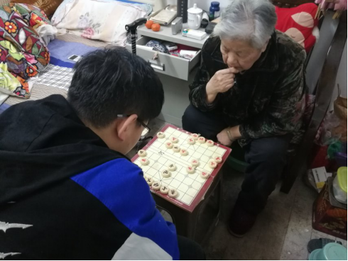 随后,志愿者们下楼陪伴老人们。志愿者们的到来给老人们平淡的生活增添了一抹光彩,老人们笑着拉着志愿者们,与他们一起聊天,虽然老人们的方言给双方交流带来了一定的困难,但这并不能阻挡双方的热情。与此同时,一位喜爱象棋的老奶奶与志愿者架起了棋桌,开始了对弈之战。这位老奶奶与下象棋的志愿者也算是“老相识”了,经常在一起下棋,可谓是棋逢对手。