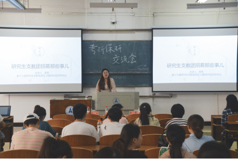紧接着,第十九届研究生支教团成员、2018级中南财经政法大学西方经济学硕士雷菁同学分享了她的支教团生活。雷菁同学为现场同学介绍了研究生支教团,并讲述了申请研究生支教团的步骤和被招募后需要做的准备,现场同学们认真了解了这一非常规的保研渠道,同时,雷菁同学还讲述了她在支教期间的趣事,使到场同学开怀大笑。