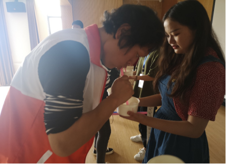 第二个游戏是用吸管运送乒乓球。学员们很快掌握了技巧并分成两组进行比赛。暂时失利的一组表演了海草舞,学员们参与度很高,气氛活跃。