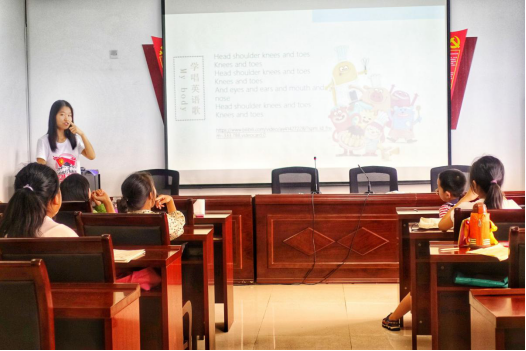 上午9点整,两位志愿者开始以生活常用英语为主题的课程教学。首先,她们带领孩子们朗读24个英文字母并学唱英语字母歌。大部分孩子都是第一次接触英语,他们认真地跟读,小脑袋跟随着歌曲的节奏摇摇晃晃,可见他们对于新知识的好奇与渴求。年仅5岁的如意小朋友勇敢地为大家表演了新学的字母歌,获得了大家的一致称赞与掌声。接着是简单词汇的认读,志愿者领读数字、颜色和身体部位的英语单词并播放旋律简单的相关英语歌曲,孩子们有板有眼地学唱,并学着一边朗读英语单词一边指认自己的身体部位,教室里的气氛轻松愉快,新知识的学习为孩子们注入了活力,同时拓宽了他们的视野,打开了通往未来丰富世界的大门。