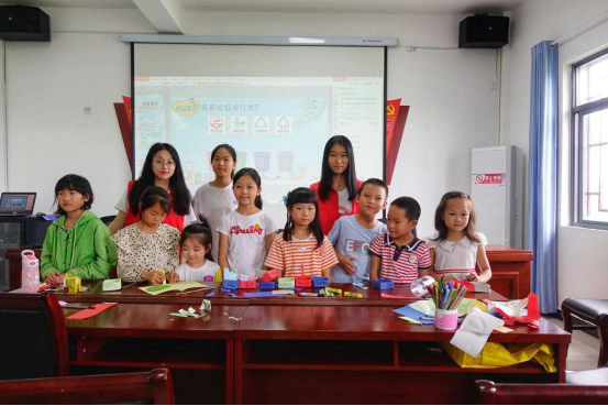 (图2:志愿者向孩子们教授垃圾分类知识)