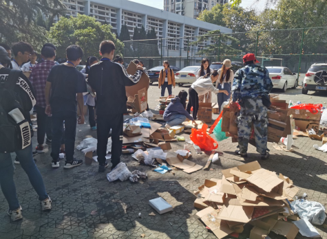 志愿者们对宿舍废品回收完毕后将其统一搬运至电教楼下空地处,并对回收的各类物品进行了归类整理,以方便收废品的工作人员进行回收。在此期间各个志愿者主动参与废品回收整理,丝毫不觉这份工作枯燥乏味。女生们不因与男生们的体力差异而减少工作量,反而帮助人数较少的男生们搬运纸箱,使整个活动过程井然有序。