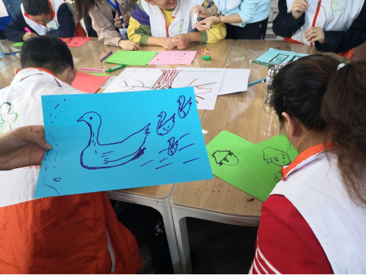 虽是初见,志愿者们很快就与学员们熟络起来。简单的画笔,单纯的色彩,清描淡写般勾勒几笔,小玲(与以下学员均为化名)纸上的鸭群便活灵活现;匠心独具的着笔,更添诗情画意,恰如小王在画旁所写“彩桥飞絮一弯泓,峰峦叠翠指蓝穹”,这是他心中的山水写意,波蕴彩桥。至于小陈笔下的智能手机,小熊的自画像,小亮所钟爱的树,无不妙趣横生,创意各具。