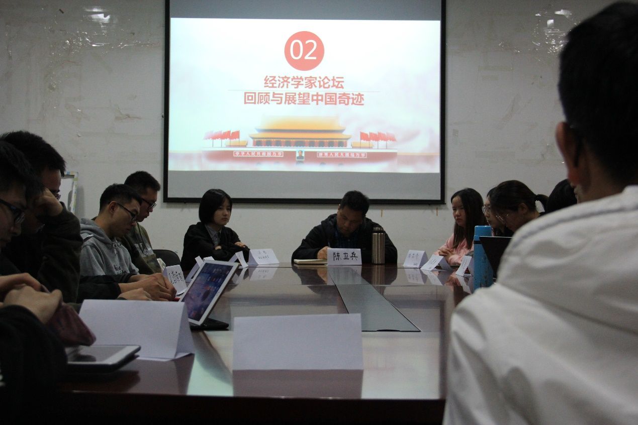 2019926日晚六点,经济学院顺利举办了以“中国70年经济奇迹”为主题的读书交流会。莅临本次读书会的嘉宾有经济学院副教授、硕士研究生导师陈立兵老师。会议由2019级经济学院研究生会学术部部员何梦茜、刘坤杰主持,以表达对70年来中国经济发展取得巨大成就的分析总结以及对中国奇迹和未来的展望。