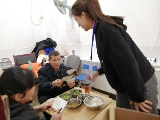 早上655分,志愿者们集合,在一些教学楼的桌子里放糖果,给同学们准备惊喜。中午1135分志愿者们在首义广场搭帐篷进行摆点布置,与此同时,一部分志愿者们亲手为学校的各位楼管人员泡热茶,12点时志愿者们按照前期的任务分配开展活动。一部分志愿者们为各位楼管工作人员送上热茶和手写的明信片,叔叔阿姨都表示:这份温暖让他们觉得辛苦的付出值得。