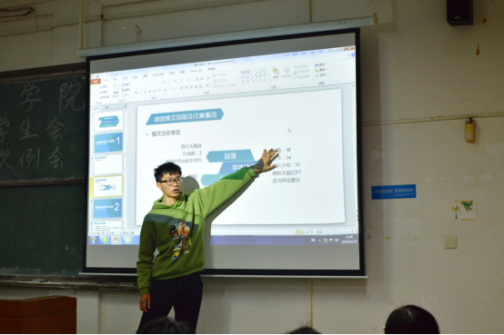 紧接着,由宣传部副部长刘锦浩同学进行推文培训。首先,刘锦浩同学为大家讲解了微信推文的排版及注意事项、审核标准及推文要求。随后,刘锦浩同学为大家介绍了推文制作软件秀米的使用方法,并通过实际操作向大家展示。