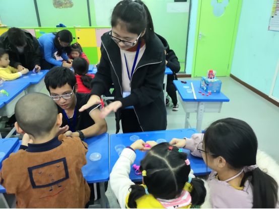 启慧幼儿园的孩子们大多是自闭症儿童,大家眼中的“来自星星的孩子”,但他们就像普通的小朋友一样活泼可爱。志愿者到来时,孩子们在老师的引导下礼貌地起立,向哥哥姐姐问好。志愿者们教小朋友做水母的福利实验,还和他们一起用粘土捏水母的模型。也许是与志愿者不熟悉的缘故,有时小朋友们的注意力会不集中,但在老师的提醒和志愿者的耐心教导下,他们渐渐地放下了戒备,与志愿者的关系变得亲密起来。
