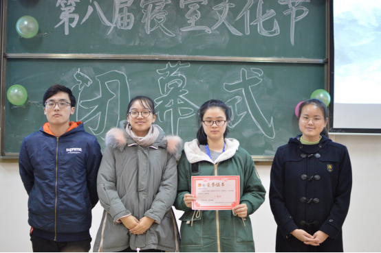 最后,主持人公布了本届寝室文化节的获奖寝室名单,其中获三等奖的寝室为54518寝室,中区11501寝室,临湖3335寝室,获二等奖的寝室为54529寝室,临湖3415寝室,荣获一等奖的寝室为54705寝室,伴随着激昂的颁奖音乐,本届寝室文化节圆满结束。