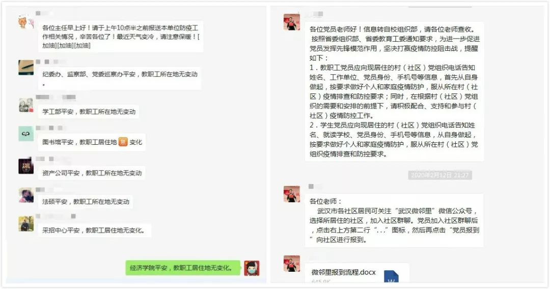 学院向学校汇报师生每日健康状况,并组织党员师生积极参与所在地的防控工作