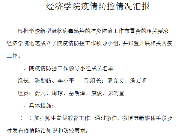 当前,新型冠状病毒感染肺炎疫情防控工作正处于关键时期,面对来势汹汹的疫情,经济学院迅速成立“疫情防控工作领导小组”,发动全体教职工立即行动起来,以必胜的信心和顽强的斗志,保持定力,履职尽责,扎实工作,为学院师生的健康安全和学校的大局稳定贡献自己的一份力量。