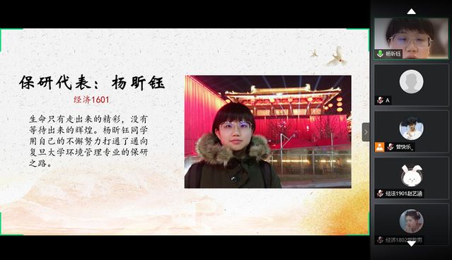 大会第四项,优秀毕业生代表青春故事分享。保研代表杨昕钰同学和刘璐同学、留学代表陈翰笛同学和冯琳文同学、服务基层代表徐义葶同学、战役志愿服务代表康咏馨同学、就业代表李芳林同学、科研代表罗力菲同学共8位优秀毕业生依次分享自己的青春故事。虽然他们的经历和经验不尽相同,但同学们的青春故事里都有一个优秀而又努力的身影和一群相知相伴的同学,都有一份对学院老师耐心指导的感激和对学校深深的眷恋与祝福。