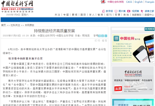 6月20日,由中南财经政法大学主办、乐鱼官方端网站登录入口和高质量发展研究中心联合承办的“疫情影响下的中国经济高质量发展”线上主题论坛受到中国社会科学报头版头条的报道。报道截图及链接如下: