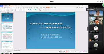 佟家栋教授从政治经济学的角度出发,进行了以《世界经济走向政治经济学的时代——战略竞耗与经贸止损》为主题的演讲。他认为中美之间的博弈已经超过国际贸易理论提出的比较优势竞争,上升到守成大国与崛起大国的战术和战略竞耗,是百年未有大变局下的战略竞争。在中国政府和企业的努力下,中国各部门的显示性比较优势愈发凸显,呈现不断累积的过程。加上面对疫情压力、经济压力、战略压力、疫情控制下的压力,美国制度优势持续弱化。于是美国由比较优势竞争转向战略竞争,对中国采取贸易战、科技战、制度战等措施阻碍中国贸易和经济增长。最后,佟教授指出面对美国的重重压力,中国采取的基本对策是:一要坚持对外开放,与除美国以外的国家积极开展国际经贸合作;二要尽可能保持与美国的贸易关系,做好贸易和经济脱钩的准备;三要做好军队打仗的准备,保持足够威慑;四要坚持改革开放,调动企业改革创新积极性;五要坚持支持科技产业和外贸企业的发展;六是内循环应该作为不得不准备的选项;七是要坚持科技战略性产业发展,坚持《中国制造2025》。